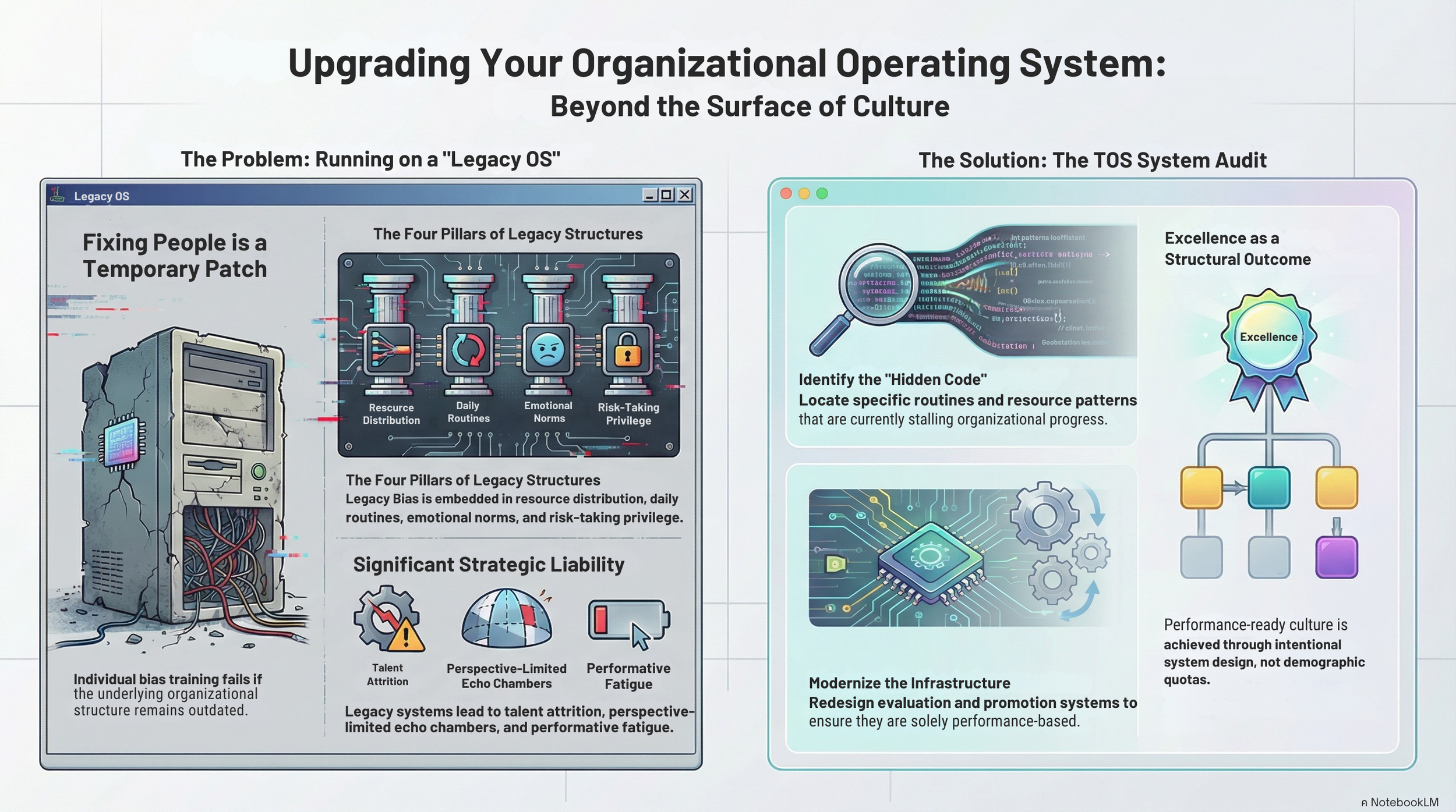 In the business and creative worlds, we often talk about "Company Culture" as if it’s something we can simply announce or change with a new set of values. But after decades of research into high-stakes organizations, I’ve found that culture is more like an Operating System. If your organization was built decades ago, it is likely running on a "Legacy OS" designed to prioritize a very specific, traditional demographic-it is a Structural Bias that silently filters out innovation, talent, and growth.