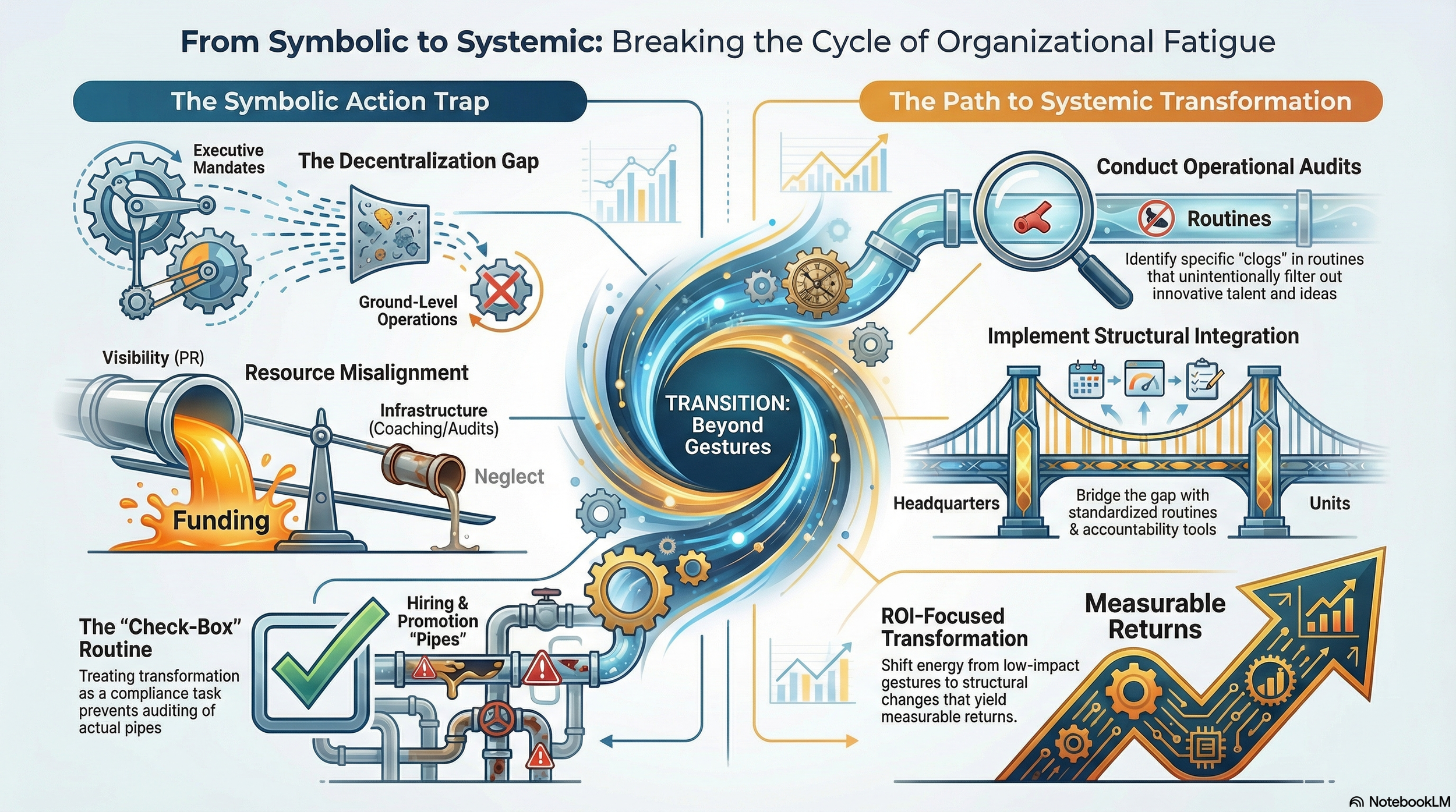 The "Check-Box" Routine: When change is treated as a compliance task to be "completed," it loses its transformative power. Real growth requires auditing the actual pipes of your organization—how you hire, how you promote, and how you assign high-value projects and decision-making.